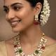 This Double Layered Mother of Pearl Mala is like jewellery royalty! With those eye-catching carved Red and Green stones and the handy drawstring, it's the go-to accessory for weddings, especially when you're flaunting a gorgeous saree. Time to shine!